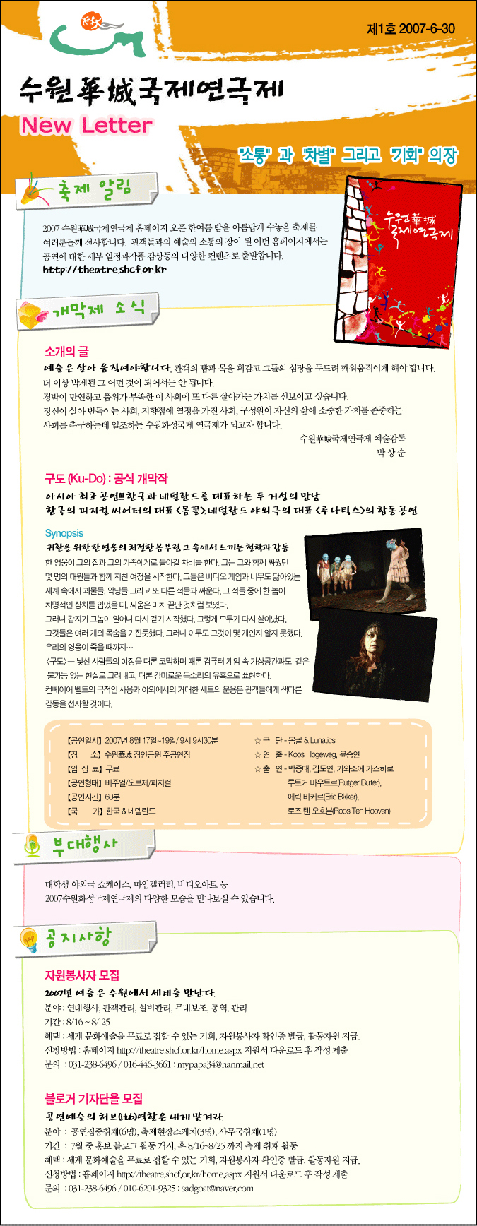 호~ 화성국제연극제가 이젠 뉴스레터까지? 이번포스터 저위 빨간색 맞나요? 해마다 멋졌는데 이번이 정말루 멋지네.. 웹용인가본데요.. 처음하신거 맞으세요??emoticon_002