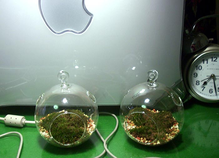 작은 유리병에 자갈을 얹고 그 위에 이끼를 심은 것입니다.