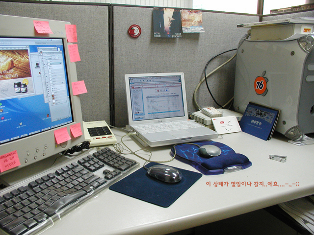 모니터에 덕지덕지 붙은 포스트잇은 뭡꽈? 글고 76은 또 뭡꽈? 글고 퀵실버밑에 끼어있눈 종이조각을 또 뭡꽈? -..-